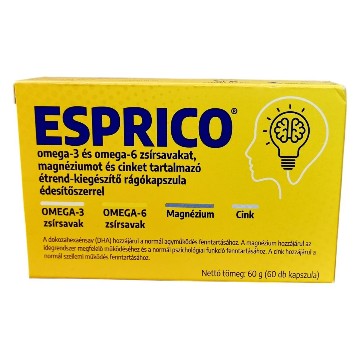 Az ESPRICO® gumírozott kapszulái gyümölcsízűek és többszörösen telítetlen zsírban gazdagok, tartalmaznak omega-3 és omega-6 zsírsavakat, mint a DHA, EPA és GLA. A termék nem tartalmaz tartósítószert, glutamátot, ftalátot, laktózt és glutént. A DHA dokozahexaénsav hozzájárulhat a normál agyműködés fenntartásához, a magnézium pedig az idegrendszer megfelelő működéséhez és a normál pszichológiai funkció fenntartásához. A cink hozzájárulhat a normál szellemi működés fenntartásához. A napi 4 kapszula bevitelével a termék töredékét biztosítja a javasolt 250 mg DHA napi mennyiségnek. Az ESPRICO® fogyasztása során fontos betartani az ajánlott adagolást, és tisztában lenni az allergén összetevőkkel, különösen hal és szójaallergia esetén.