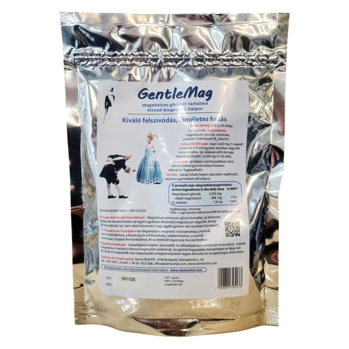 A magnézium-glicinát egy magnézium-aminosav komplex, amely az aminosav kötés révén kiemelkedően jól felszívódó magnézium-vegyület, jól tolerálható módon, amely például nem okoz hasmenést vagy egyéb gyomor-bél rendszeri tüneteket. A termék hozzájárulhat az idegrendszer megfelelő működéséhez, a normál izomműködéshez, a fáradtság és kimerültség csökkentéséhez, a normál csontozat és fogazat fenntartásához, valamint az elektrolit egyensúly megőrzéséhez. Az italpor fogyasztásához legalább 180 ml vízben, gyümölcslében vagy teában kell feloldani. A termék nettó tömege 216 g, az adagok száma 50. A termék gyártója és forgalmazója a Siema Vital Kft, amely Budapesten található. A részletes információk elérhetők a gyártó weboldalán.
