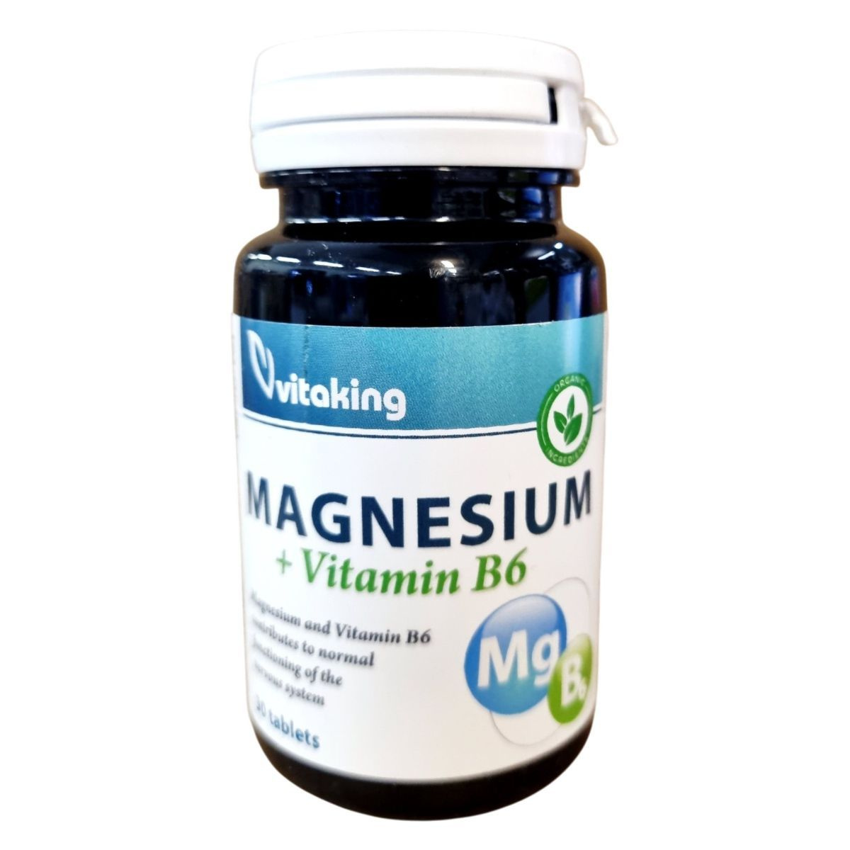 A Vitaking Magnesium + Vitamin B6 étrend-kiegészítő 30 tablettát tartalmaz, melyek magnéziumot és B6-vitamint biztosítanak a szervezet számára. A magnézium és a B6-vitamin hozzájárulhatnak az idegrendszer normál működéséhez. A termék vízmentes magnézium citrátot és különféle stabilizáló, csomósodást gátló anyagokat tartalmaz. A termék minőségét a doboz oldalán jelzett időpontig őrzi meg, és fontos, hogy gyermekek elől elzárva, száraz, hűvös helyen tároljuk.