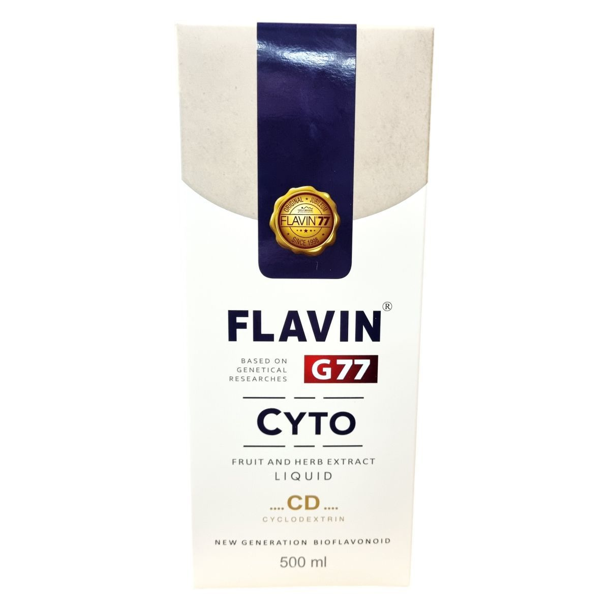 A Flavin G77 Cyto gyümölcs- és gyógynövény szirup egy gondosan összeállított termék, mely a genetikai kutatások eredményeire alapozva kínál különleges növényi hatóanyagokat. A 77 féle gyümölcs, virág, magvak, gyógynövény, fűszer, gyökér és levél szárított őrleményei egy komplex, természetes formula részei, melyek bioflavonoidokban és telítetlen zsírsavakban gazdagok. Összetételében szerepelnek többek között kurkuma gyökér kivonat, articsóka őrlemény, gránátalma kivonat, Sophora japonica, búzacsíra, brokkolicsíra, lucernacsíra, zöld tea kivonat, kamilla, máriatövis, Polygonum cuspidatum gyökér kivonat és más természetes összetevők. A termék nem tartalmaz tartósítószert, ezért fogyasztás előtt fel kell rázni, és az erjedés elkerülése érdekében mindig tiszta pohárba ajánlott önteni. A készítmény nem ajánlott várandós vagy szoptató nőknek, valamint 18 év alatti gyermekeknek, illetve nem fogyasztható együtt más zöld teát tartalmazó termékekkel azonos napon. Kisgyermekek elől elzárva szükséges tárolni. A palack 500 ml térfogatú, 10-20 °C között, hűtve tárolandó.
