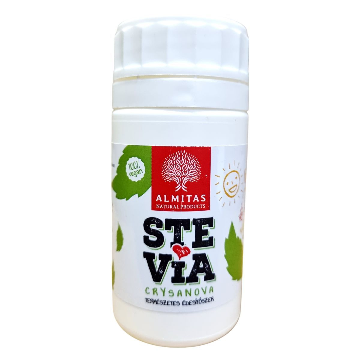 Az ALMITAS Stevia Crysanova egy természetes édesítőszer, amely eritritol és szteviol-glikozid alapú. Kiválóan alkalmas sütemények és krémek édesítésére, mivel egy lapos teáskanál por körülbelül 200g cukor édesítő hatásával egyenértékű. A termék bio és vegán étrendbe is beilleszthető, és kalóriamentes, így ideális választás fogyókúrákhoz és egészségtudatos életmódhoz. Fontos azonban figyelni a mértékletes fogyasztásra, mivel túlzott bevitele hashajtó hatású lehet. A terméket száraz, hűvös, fénytől védett helyen ajánlott tárolni.
