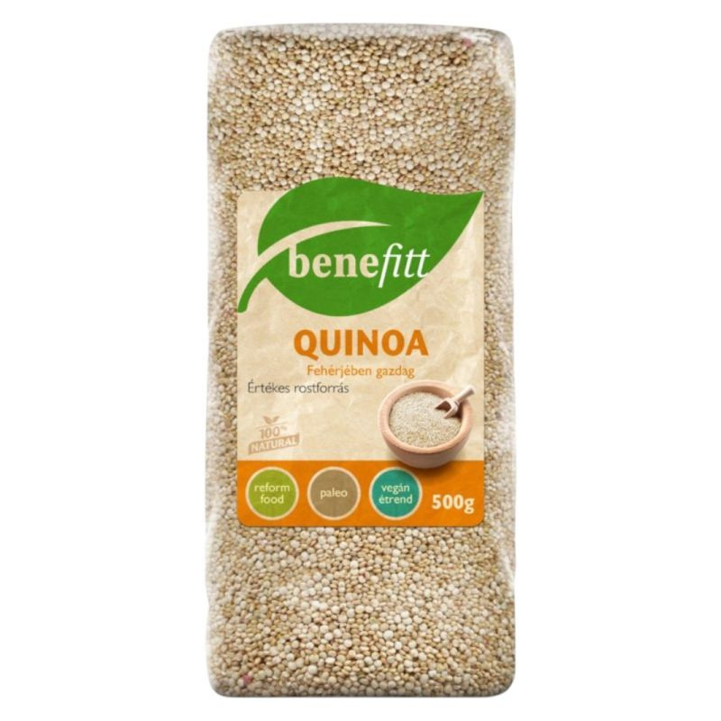 A Benefitt quinoa egy teljes értékű, gluténmentes mag, amely magas fehérje- és rosttartalma miatt akár egy kiegyensúlyozott étrendben is jól illeszthető lehet. Használható kásaként, köretként vagy töltelékként — felhasználása egyszerű, és akár háromszoros tömegű is lehet főzés után, ezáltal gazdaságos és kiadós. Tárolása praktikus, és hosszabb távon is megőrzi minőségét megfelelő környezetben. Forgalmazója a BGB Interherb Kft.
