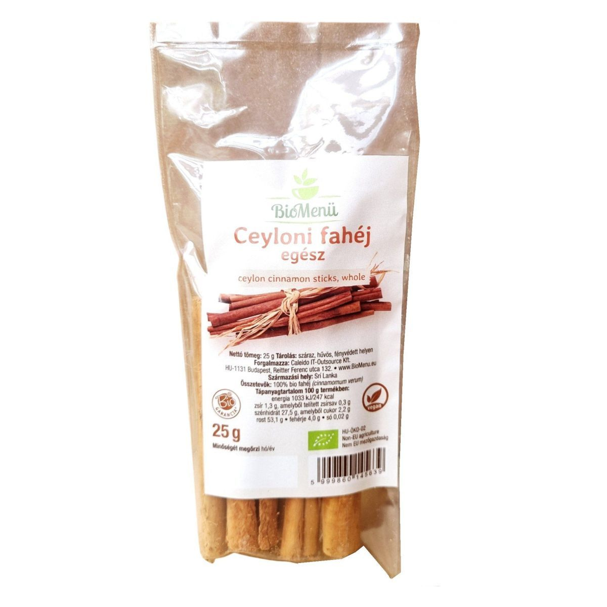 A BioMenü Ceyloni fahéj egy prémium minőségű, egész fahéj termék, amely 100% bio összetevőkből áll. A termék Sri Lankáról származik, és a Caleido IT-Outsource Kft. forgalmazza Magyarországon. A fahéj gazdag rosttartalmú, alacsony zsírtartalommal rendelkezik, és ideális választás lehet a vegán étrendet követők számára. A termék HU-ÖKO-02 tanúsítvánnyal rendelkezik, amely biztosítja a bio minőséget. Tárolása száraz, hűvös és fényvédett helyen ajánlott.