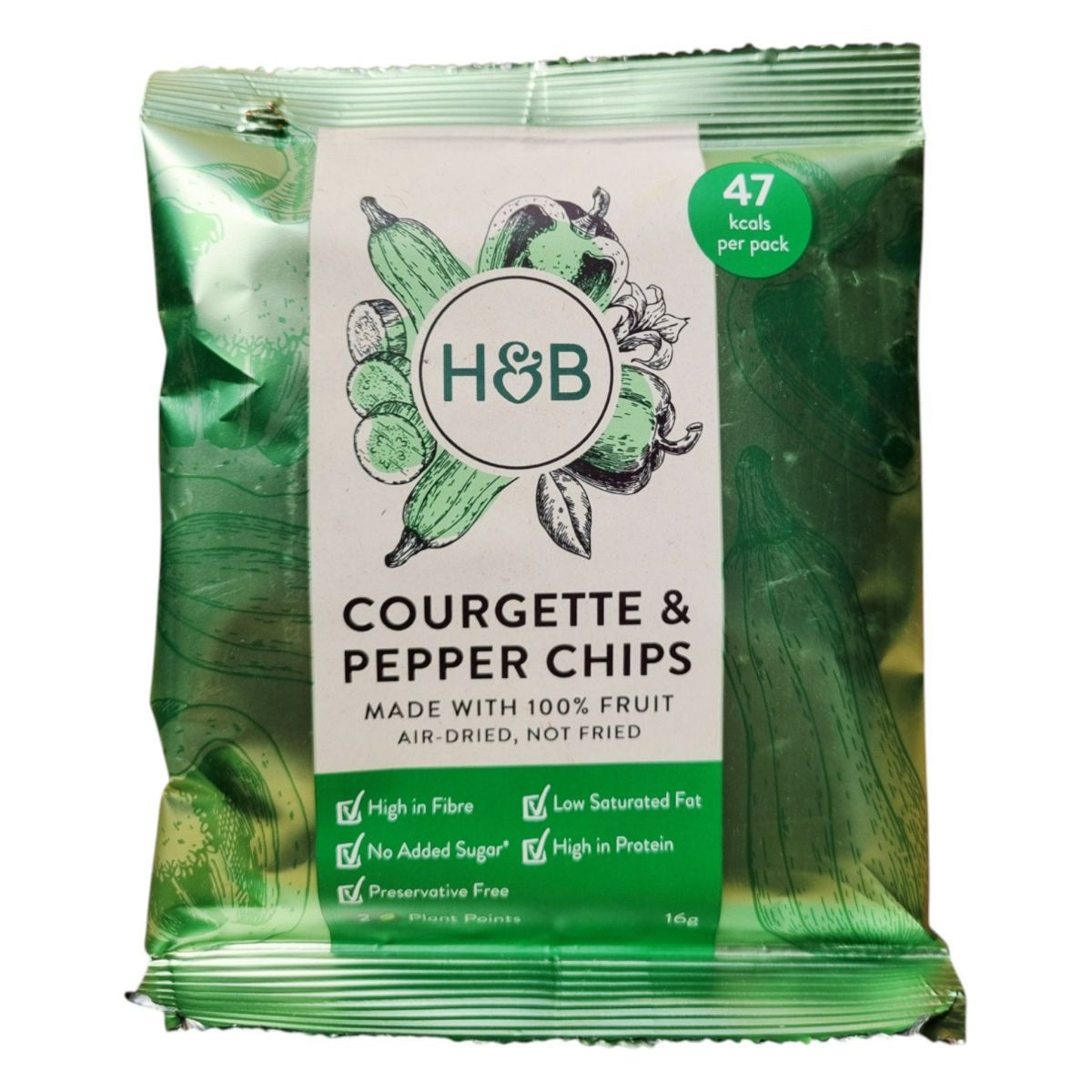 A H&B Courgette & Pepper Chips egy innovatív snack, amely cukkini és paprika felhasználásával készült. A termék levegőn szárított, így megőrizheti a zöldségek természetes ízét és tápanyagait. A chips magas rost- és fehérjetartalmú, alacsony telített zsírtartalommal rendelkezik, és nem tartalmaz hozzáadott cukrot vagy tartósítószert. A termék 47 kcal-t tartalmaz adagonként (16g), és természetes cukrokat tartalmazhat. A csomagolás újrahasznosítható a puha műanyag gyűjtőpontokon, de otthon nem újrahasznosítható.