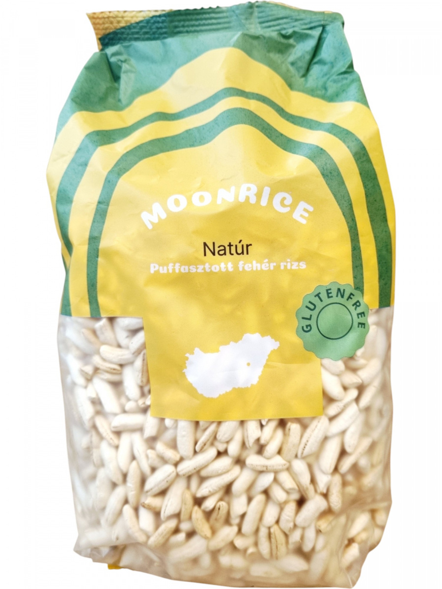 A Moonrice natúr puffasztott fehér rizs magyar termék, amely egyszerű, természetes alapanyagból készül. A csomagolás 85 g-ot tartalmaz, amely kb. 3 adag. Könnyű, ropogós állagának köszönhetően önmagában fogyasztható nassolnivalóként, vagy különféle ételek, joghurtok, saláták kiegészítőjeként. A gluténmentesség biztosítja, hogy érzékenyek számára is alkalmas választás. A termék energia- és tápanyagtartalma alapján jól illeszthető kiegyensúlyozott étrendbe.