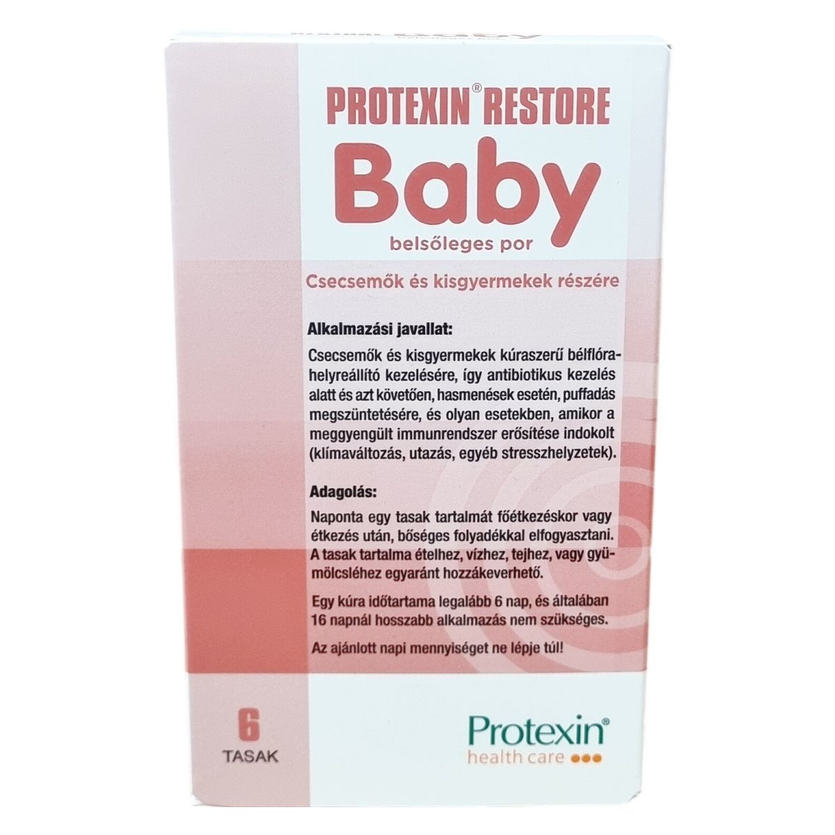 A Protexin® RESTORE Baby gyógyszernek nem minősülő gyógyhatású készítmény, hatását szakirodalmi adatok igazolják. Hatóanyagai olyan probiotikus baktériumok, melyek az egészséges szervezet bélflórájának összetevői, hozzájárulhatnak a bélflóra helyreállításához antibiotikus kezelés alatt és után, hasmenések esetén, puffadás megszüntetésére, valamint olyan esetekben, amikor a meggyengült immunrendszer erősítése indokolt, például klímaváltozás, utazás vagy egyéb stresszhelyzetek idején. A termék tasakos kiszerelésben kapható, egy tasak 1 milliárd élő probiotikus baktérium csírát tartalmaz, valamint prebiotikumként inulint, amely fokozhatja a baktériumok hatását. A készítményt bőséges folyadékkal, étkezéskor vagy után ajánlott fogyasztani, akár ételbe, tejbe vagy gyümölcslébe keverve, kúraszerűen alkalmazva legalább 6 napig, maximum 16 napig, az ajánlott mennyiség túllépése nélkül. Megfelelő tárolása az eredeti csomagolásban, száraz, legfeljebb 25°C hőmérsékletű helyen történjen.