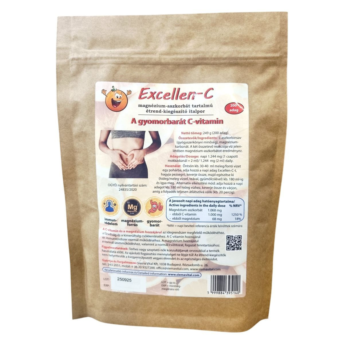 Az Excellen-C egy magnézium-aszkorbát tartalmú étrend-kiegészítő italpor, amely víz jelenlétében magnézium-aszkorbátot eredményez L-aszkorbinsav és magnézium-karbonát reakciójával. Használata egyszerű: a napi adagot meleg vagy forró vízbe kell keverni, majd a keveréket további vízzel, teával vagy gyümölcslével kiegészítve fogyasztható. Alternatív módon a napi adag hideg vízben is elkeverhető, és kb. 20 perc várakozás után fogyasztható. A termék javasolt adagja napi 1.244 mg, amelyből 1.000 mg C-vitamin és 68 mg magnézium származik. A C-vitamin és a magnézium hozzájárulhat az idegrendszer megfelelő működéséhez, a fáradtság és kimerültség csökkentéséhez, az immunrendszer normál működéséhez, valamint a normál izomműködéshez és a csontozat, fogazat fenntartásához. Az Excellen-C gyomorbarát C-vitamin forrásként szolgál, és napi 200 adag elkészítésére elegendő mennyiséget tartalmaz.