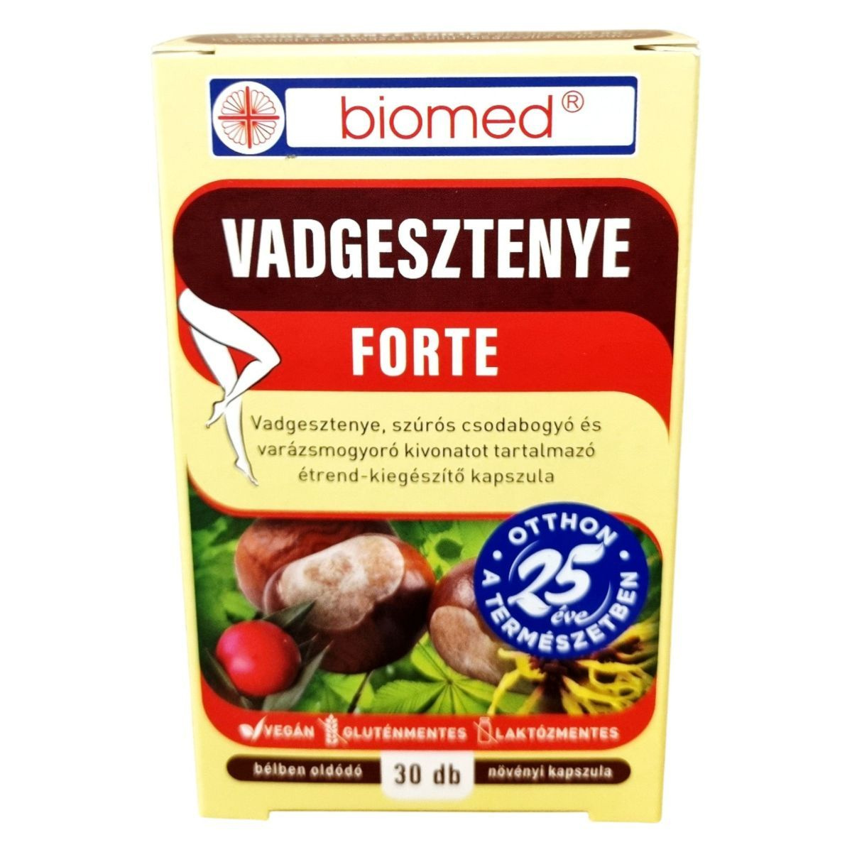 A Biomed Vadgesztenye Forte étrend-kiegészítő kapszula a vénás keringés támogatására összeállított növényi kivonatokat tartalmaz: vadgesztenye, szúrós csodabogyó és varázsmogyoró kivonatot, kiegészítve C-vitaminnal. A vadgesztenye természetes eszcin-tartalma hozzájárulhat az erek rugalmasságának megőrzéséhez, míg a csodabogyó és a varázsmogyoró a lábak megfelelő keringését és komfortérzetét támogathatják. A C-vitamin elősegítheti a normál kollagénképződést, ezzel az erek egészséges működését. A termék vegán, gluténmentes és laktózmentes, bélben oldódó növényi kapszula formában kapható, amely kúraszerűen is alkalmazható a lábak jó közérzetének fenntartásához.