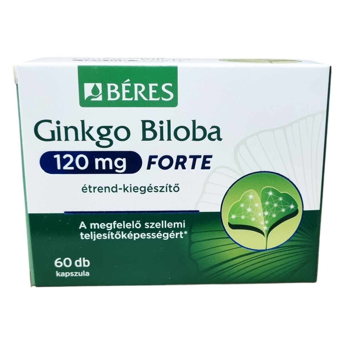 A Béres Ginkgo Biloba 120 mg FORTE kapszula Ginkgo biloba kivonatot tartalmazó étrend-kiegészítő, mely a megfelelő vérkeringéshez és szellemi teljesítőképességhez járulhat hozzá. A termék 60 darab 0,495 g-os kapszulát tartalmaz. Hatóanyagként 120 mg Ginkgo biloba levél kivonatot tartalmaz, amely 28,8 mg flavon glikozidot biztosít kapszulánként. Az összetevők között maltodextrin, zselatin, csomósodást gátló anyag, valamint színezékek is megtalálhatók. A készítményt felnőttek részére fejlesztették ki, az ajánlott adag napi egy kapszula. Fontos figyelmeztetések vonatkoznak terhes, szoptató nők és véralvadásgátló kezelést kapók számára, továbbá a vércukorszint befolyásolása miatt cukorbetegek esetében orvosi konzultáció javasolt. A termék nem helyettesíti a kiegyensúlyozott étrendet és az egészséges életmódot.