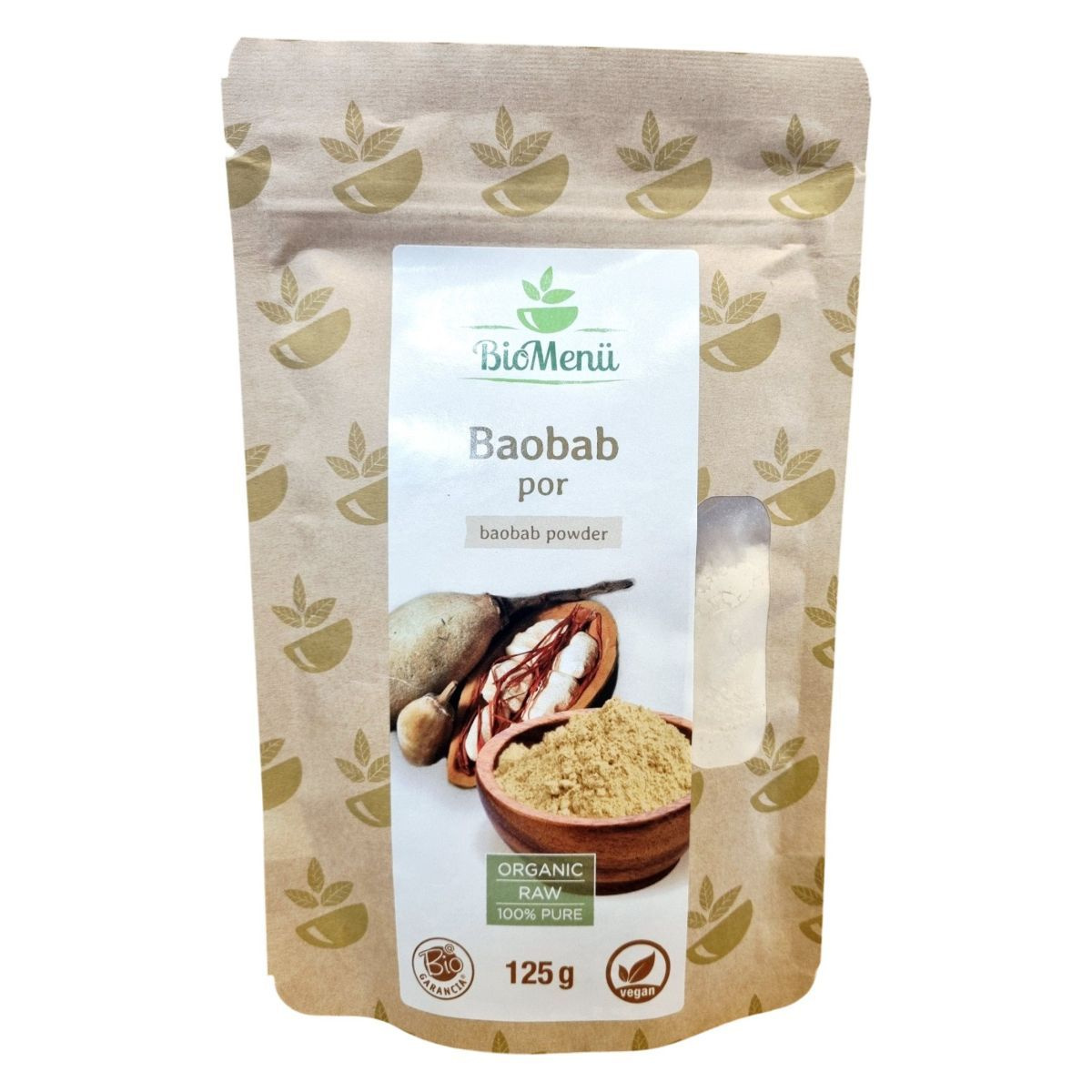 A BioMenü BIO BAOBAB por egy 100% tiszta, organikus termék, amely Dél-Afrikából származik. A baobab gyümölcshús gazdag rostokban, és alacsony zsírtartalmú, így ideális kiegészítője lehet a különböző étrendeknek. A termék bio, raw és vegán minősítéssel rendelkezik, és a HU-ÖKO-02 tanúsítvány garantálja a minőségét. A baobab por könnyen beilleszthető a mindennapi étrendbe, például turmixokhoz, müzlikhez vagy túróhoz keverve. A termék táplálkozási tulajdonságai változhatnak a környezeti feltételektől függően, ezért fontos a megfelelő tárolás.