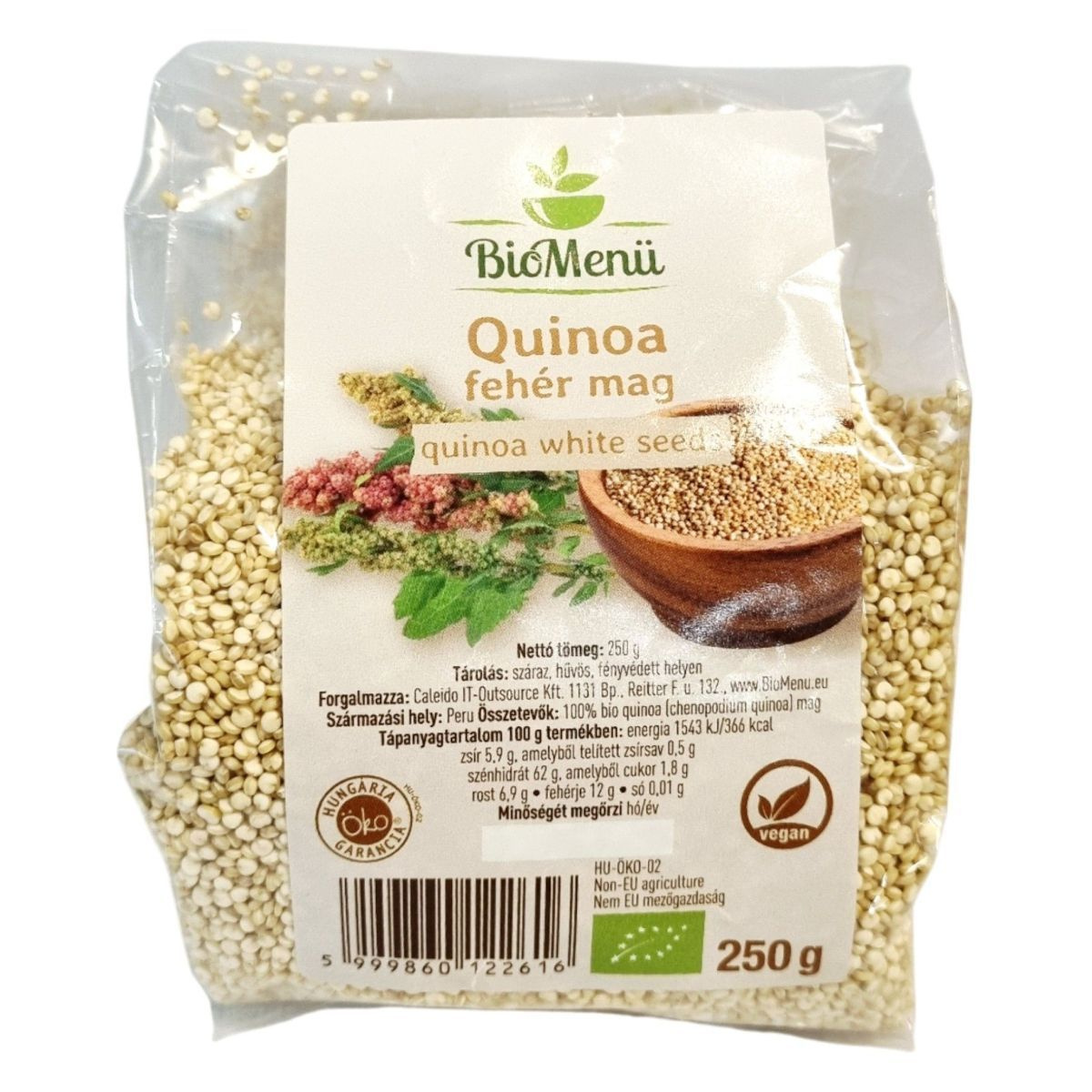 A BioMenü Quinoa fehér mag egy prémium minőségű, 100% bio termék, amely Peruból származik. A termék HU-ÖKO tanúsítvánnyal rendelkezik, és a HUNGARIA ÖKO GARANCIA biztosítja a minőséget. A quinoa gazdag tápanyagokban, ideális választás vegán étrendhez. A termék forgalmazója a Caleido IT-Outsource Kft., és a termék csomagolásán található engedélyszám: HU-ÖKO-02. A quinoa tárolása száraz, hűvös, fényvédett helyen javasolt, hogy megőrizze minőségét.