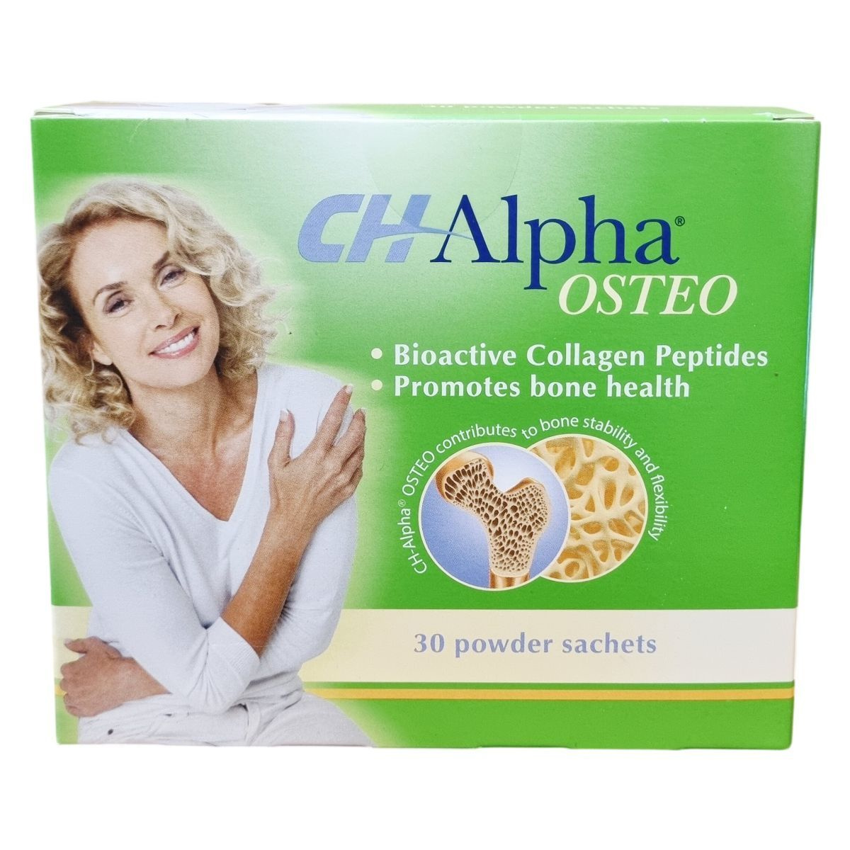 A CH Alpha OSTEO egy étrend-kiegészítő, amely a csontozat megfelelő szerkezetének támogatására készült. A termék speciális bioaktív kollagén peptideket, ionizált kalcium-laktátot és D3-vitamint tartalmaz, ami hozzájárulhat a csontok stabilitásához és rugalmasságához. A kollagén a csontok mátrixának fő összetevője, amely kalcium háttérként szolgál, míg a kalcium és a D-vitamin a normál csontok fenntartásához szükségesek. A termék por alakban, kellemes citrom ízű tasakokban kapható, megkönnyítve a napi egyszeri adagolást. Az étrend-kiegészítő Németországban készül, és nem észleltek ellene nemkívánatos mellékhatásokat vagy kölcsönhatásokat.