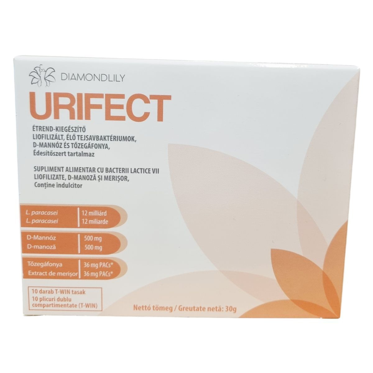 Az URIFECT egy innovatív T-WIN tasakos kiszerelésű étrend-kiegészítő, amely két rekeszben külön tárolja az összetevőket az optimális hatás és oldódás érdekében. Egyik fele liofilizált Lactobacillus paracasei-t, a másik D-mannózt és tőzegáfonya-kivonatot tartalmaz. A termék nem tartalmaz glutént, színezéket céklából és édesítőszert (szukralózt) tartalmaz. Nettó tömeg: 30 g (10 db T-WIN tasak, 3 g/tasak).
