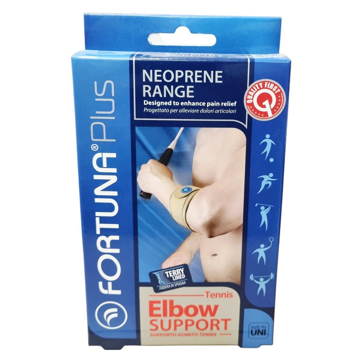 A Fortuna International neoprén támaszok kiváló minőségű neoprén gumiból készülnek, amelyek állandó, egyenletes kompressziót és támogatást nyújtanak. A belső frottír bélés csökkenti az izzadtság felgyülemlését és növeli a komfortérzetet. A támasz megtartja a test melegét, ami serkenti a vérkeringést a sérült területen, elősegítve a természetes gyógyulást és kényelmet biztosít. A meleg hatás javítja az izmok és ízületek rugalmasságát, segítve a sportbalesetek megelőzését. A termék kézzel mosható langyos, szappanos vízben, majd levegőn szárítandó. A termék univerzális méretű, bármelyik könyök középső részén legfeljebb 37,5 cm-es körfogatig használható.