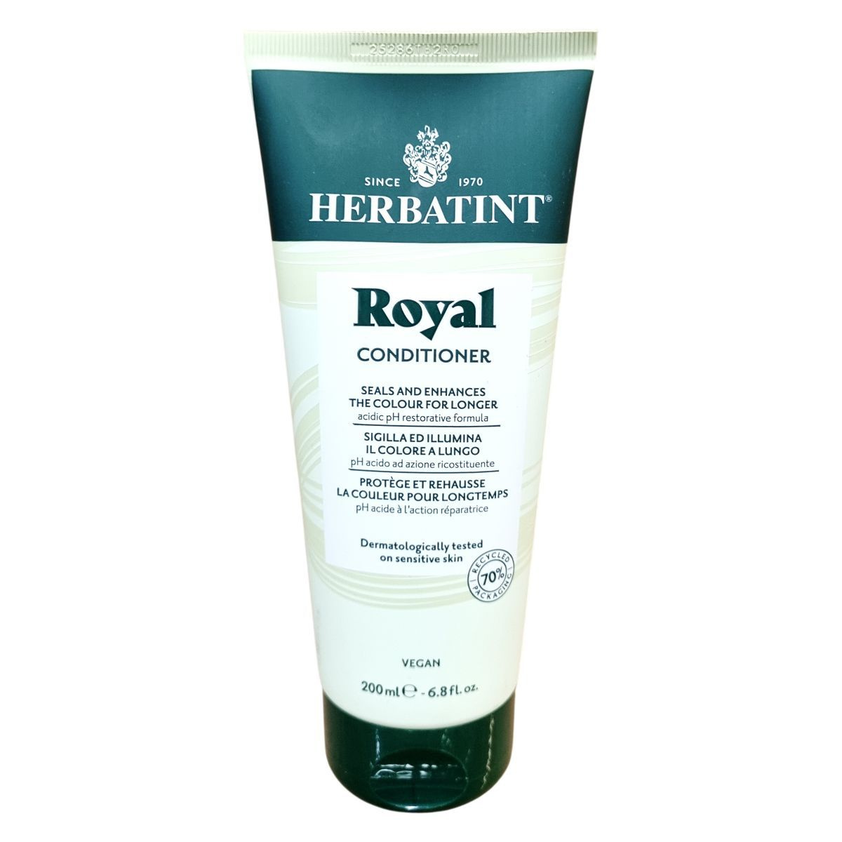 A Herbatint Royal Kondicionáló savas pH-értékű, regeneráló formula, amely hosszabb ideig zárja és erősíti a haj színét. Az Aloe Vera különösen tápláló és helyreállító hatású, míg a jojoba olaj kondicionálja a hajat, megkönnyítve a fésülést. Termék érzékeny bőrön is dermatológiailag tesztelt, környezettudatos csomagolásban, amely 70%-ban újrahasznosított műanyagból készült. 96%-ban természetes eredetű összetevőket tartalmaz, és vegán formulájával támogatja a haj egészségét minden típus számára, különösen a száraz, gyenge vagy festett hajat.