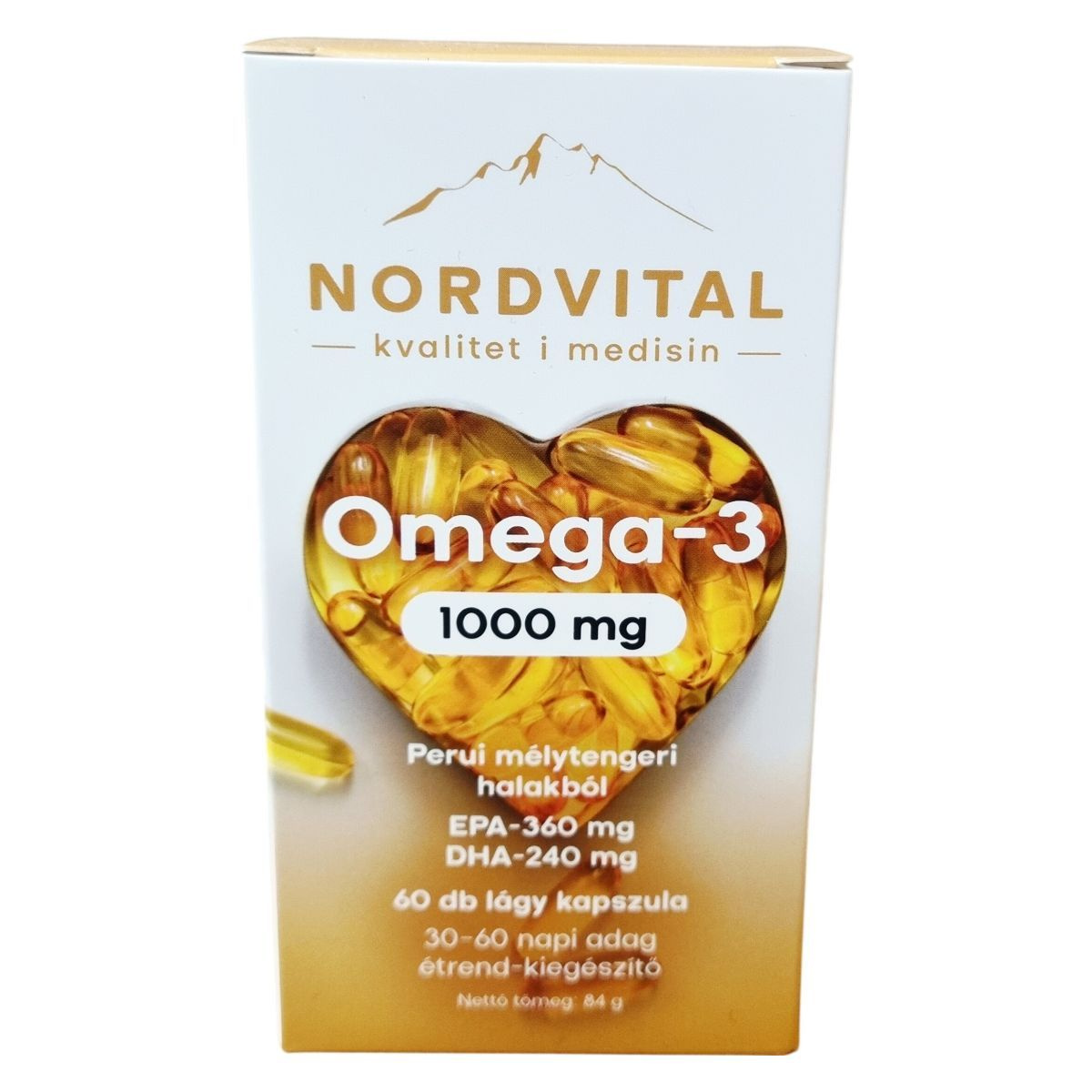 A NORDVITAL Omega-3 kapszula Peru térségében halászott, szabadon élő, mélytengeri apróhalakból készült halolajat tartalmaz. A termék tisztaságát és felszívódását kiemelten kezelik, miközben karbonsemleges vállalatként működnek. Az EPA és DHA napi bevitele hozzájárulhat a szív normál működéséhez, a DHA a normál agyműködés és látás fenntartásához, valamint az anyai DHA bevitel a magzat és a szoptatott csecsemők normális szem- és agyfejlődéséhez. A termék GMP (Good Manufacturing Practice) minősítéssel rendelkező gyártóüzemben készül, laborban bevizsgált, és szigorú minőségi követelményeknek felel meg. Kiszerelése 60 db lágy kapszula, ami 30-60 napi adagnak felel meg, nettó tömege 84 g.