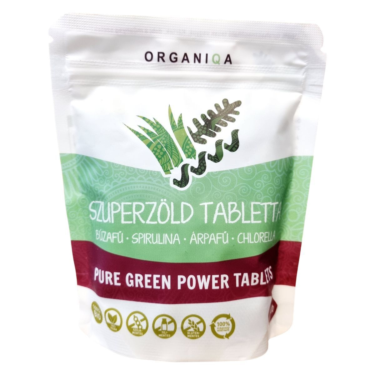 A Szuperzöld Tabletta egy bio alapanyagokból készült étrend-kiegészítő, amely búzafű, spirulina, árpafű és chlorella porokat tartalmaz. A termék 100% újrahasznosítható tasakban érkezik, és természetes módon előforduló szulfitokat tartalmazhat. Az ellenőrzött ökológiai gazdálkodásból származó termék Kínából származik, és a Biokontroll Hungária Nonprofit Kft. által ellenőrzött. A tabletták gyümölcslével vagy vízzel könnyen bevehetők.