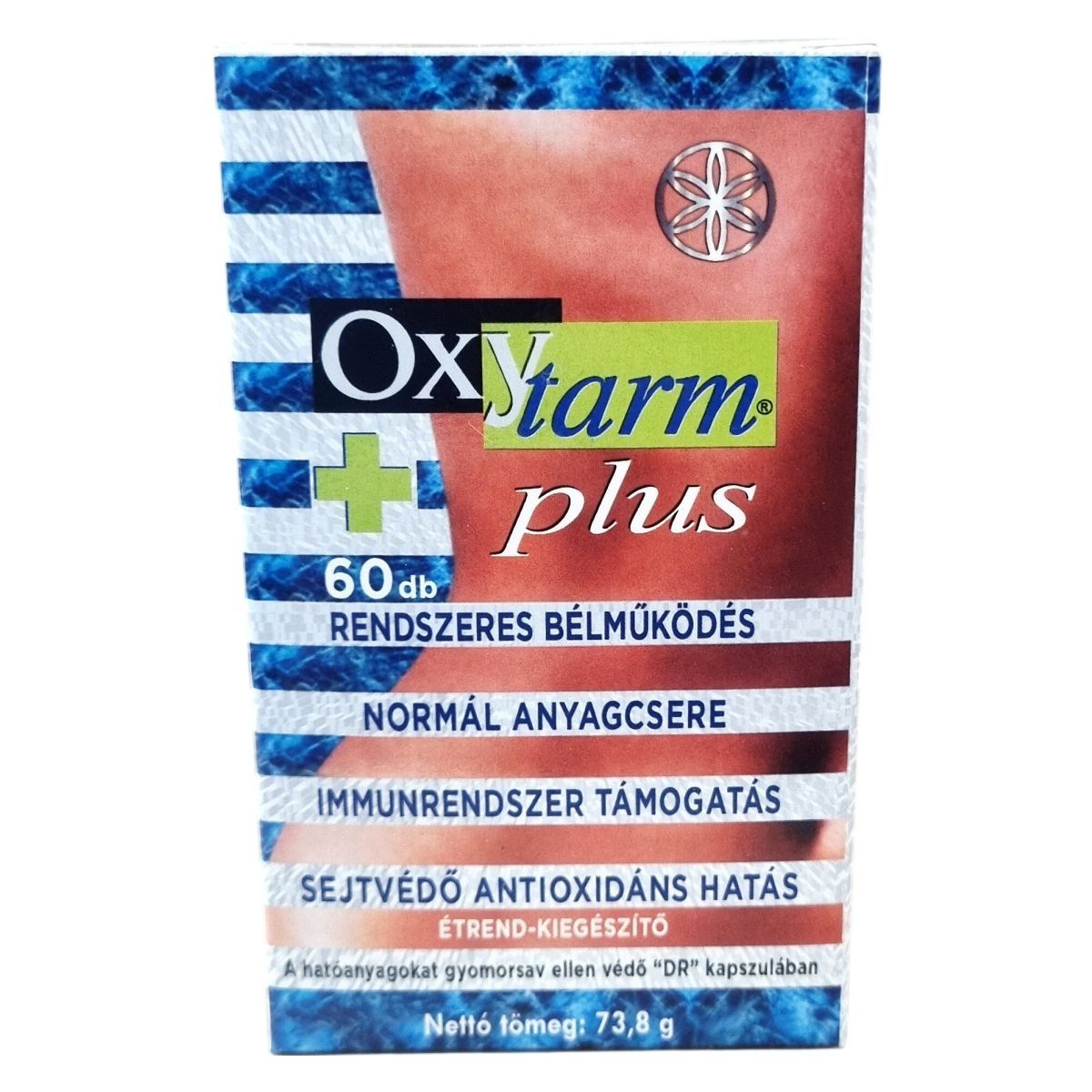 Az OxYtarm® plus kapszula hatóanyagai között szerepel a mályva kivonat, amely hozzájárulhat az emésztőrendszer egészséges működéséhez és a bélműködés fenntartásához. Az A-vitamin részt vehet a nyálkahártyák, bőr és látás normál állapotának fenntartásában, valamint az immunrendszer megfelelő működésében. Magnézium támogatja az elektrolit-egyensúlyt, energiatermelő anyagcsere-folyamatokat, idegrendszer működését és az izomműködést. A tiamin (B1-vitamin) hozzájárulhat az idegrendszer és a szív normál működéséhez és az energiatermelő folyamatokhoz. A cink részt vehet az immunrendszer támogatásában, a sejtek oxidatív stresszel szembeni védelmében, valamint a csontozat, bőr és látás fenntartásában. A folát hozzájárulhat az immunrendszer működéséhez, a fáradtság csökkentéséhez és a vérképződéshez, továbbá szerepet játszhat a terhesség alatt az anyai szövetek növekedésében. A C-vitamin támogatja az immunrendszert, sejtvédelemben és a kollagénképződés folyamatában vesz részt, amely fontos a csontrendszer, porcok, fogak és bőr egészségéhez, valamint elősegíti a vas felszívódását. A hatóanyagokat gyomorsav ellen védő "DR" kapszulában találhatók meg. A nettó tömeg 73,8 g.