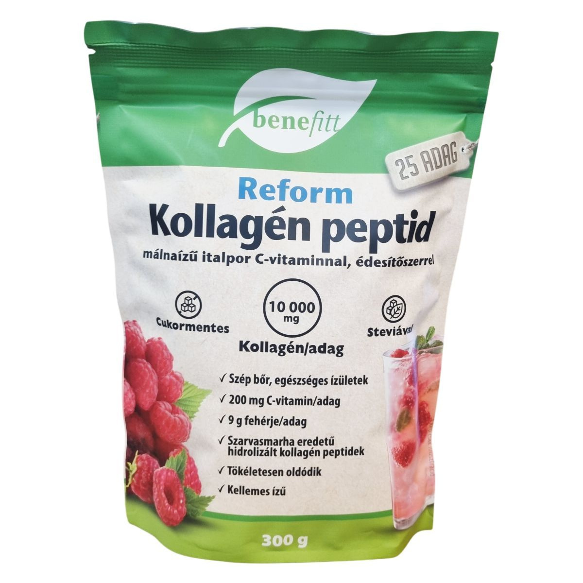 A benefitt Reform Kollagén peptid egy kellemes, frissítő ízű málnaiízű instant italpor, amely hidrolizált kollagén peptideket és C-vitamint tartalmaz. A kollagén a bőr és a porcszövet alapvető vázanyaga, mely hozzájárulhat a bőr rugalmasságának és a porcszövet épségének megőrzéséhez. A C-vitamin szerepet játszhat a megfelelő kollagénképződésben, valamint a bőr, a porc- és csontszövet normál állapotának fenntartásában. A termék közepes molekulatömegű, hatékonyan felszívódó hidrolizált kollagénből készül, amely szarvasmarha eredetű, elsődleges összetevője Argentínából származik. Az italpor könnyen oldódik akár hideg vízben is, hozzáadott cukrot és tartósítószert nem tartalmaz. Természetes módon glutén- és laktózmentes. A gyártó üzem glutén-, szója-, tojás- és tejmentes környezetben működik. A csomagolás 100%-ban újrahasznosítható, így a környezet védelméhez is hozzájárulhat.